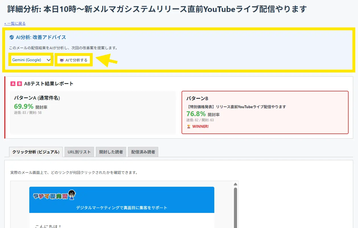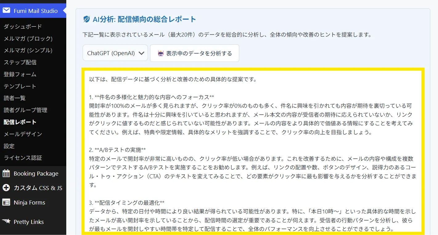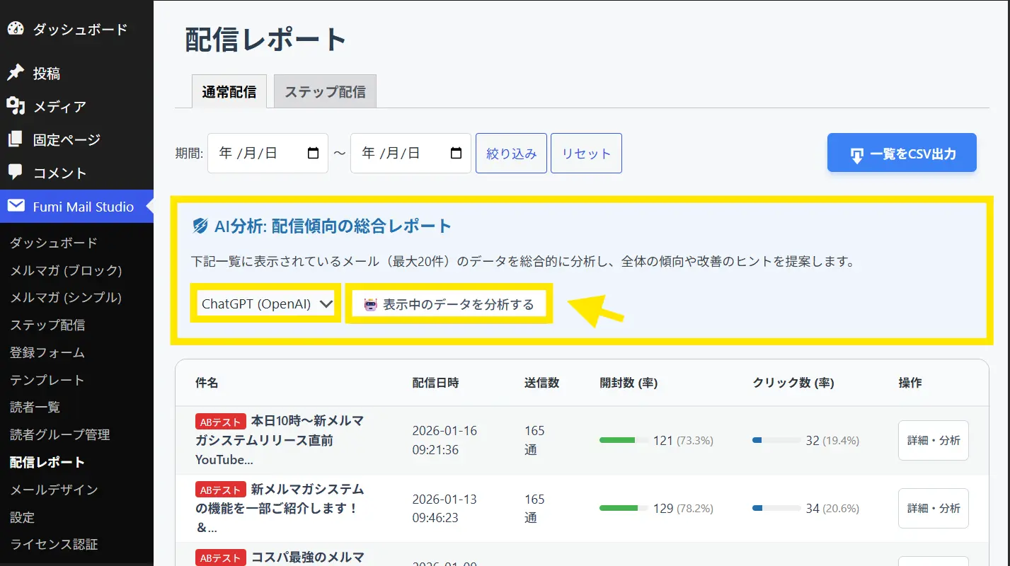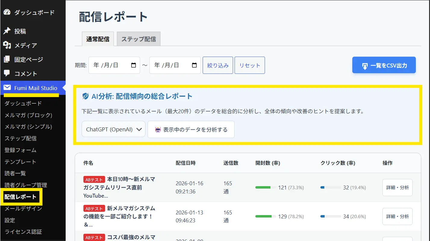 ↓「Fumi Mail Studio」>「配信レポート」へいきます。そうすると上部に「AI分析:配信傾向の総合レポート」というメニューがあります。