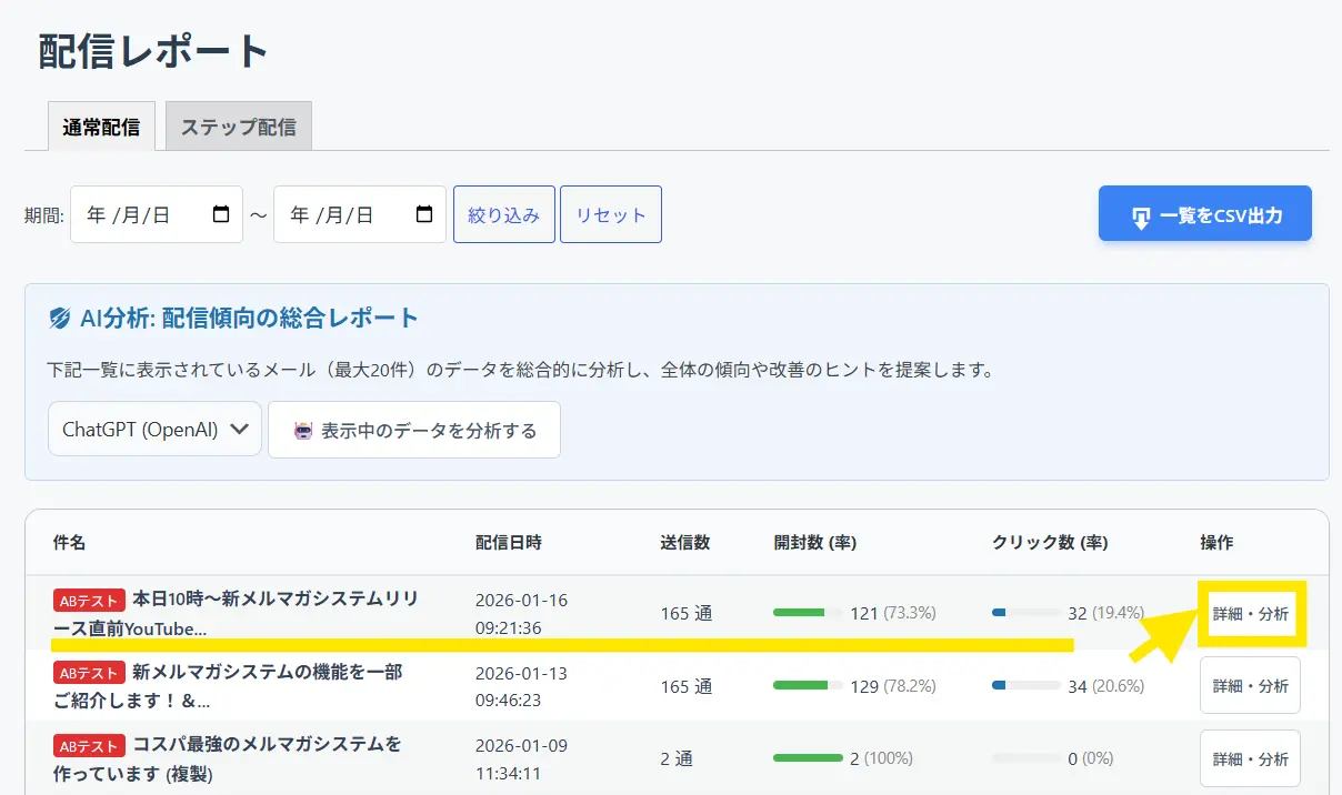 ・「AI分析」が使えるのは「配信レポート」の画面です。