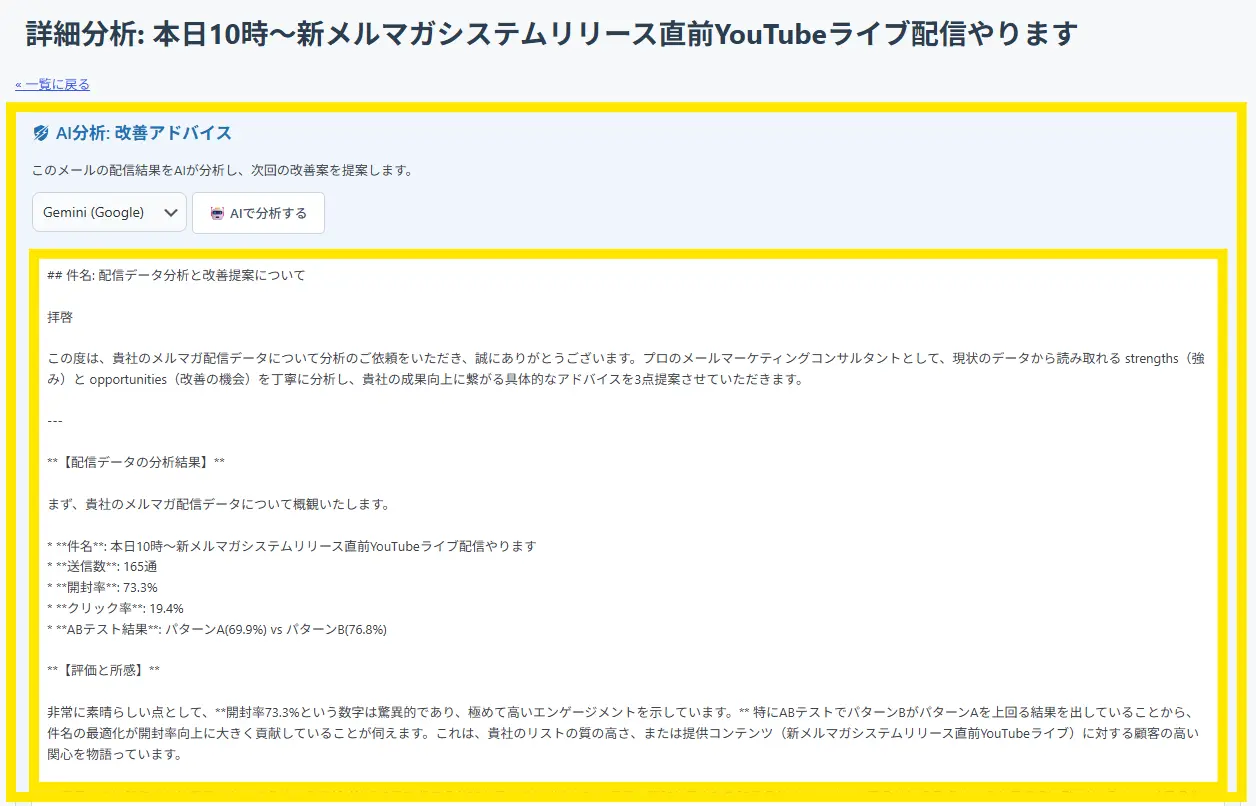 ↓そうすると、個別のメールについても分析結果や改善案を提案してくれます。
