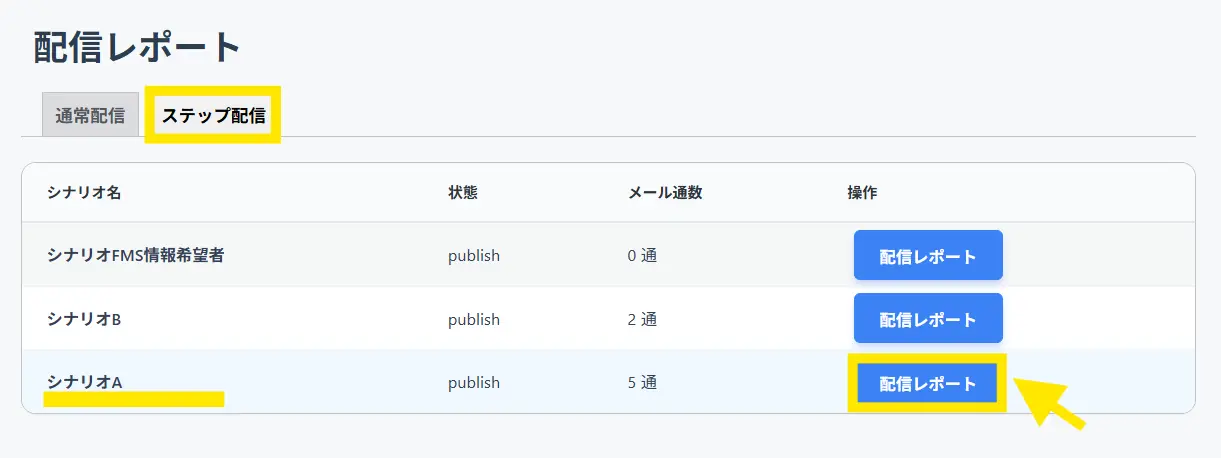 ↓上部の「ステップ配信」タブをクリックし、分析したいシナリオの「配信レポート」へ行きます。