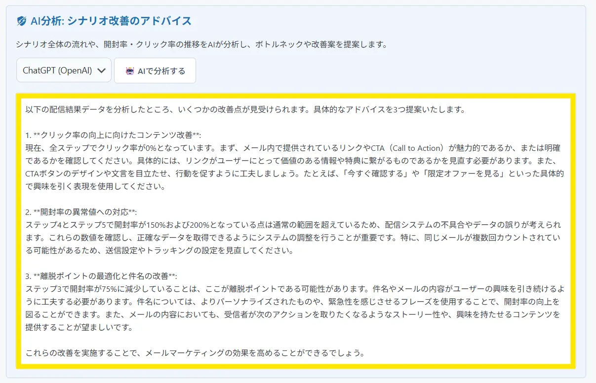 ↓そうすると、シナリオ全体の配信状況を分析しアドバイスしてくれます。