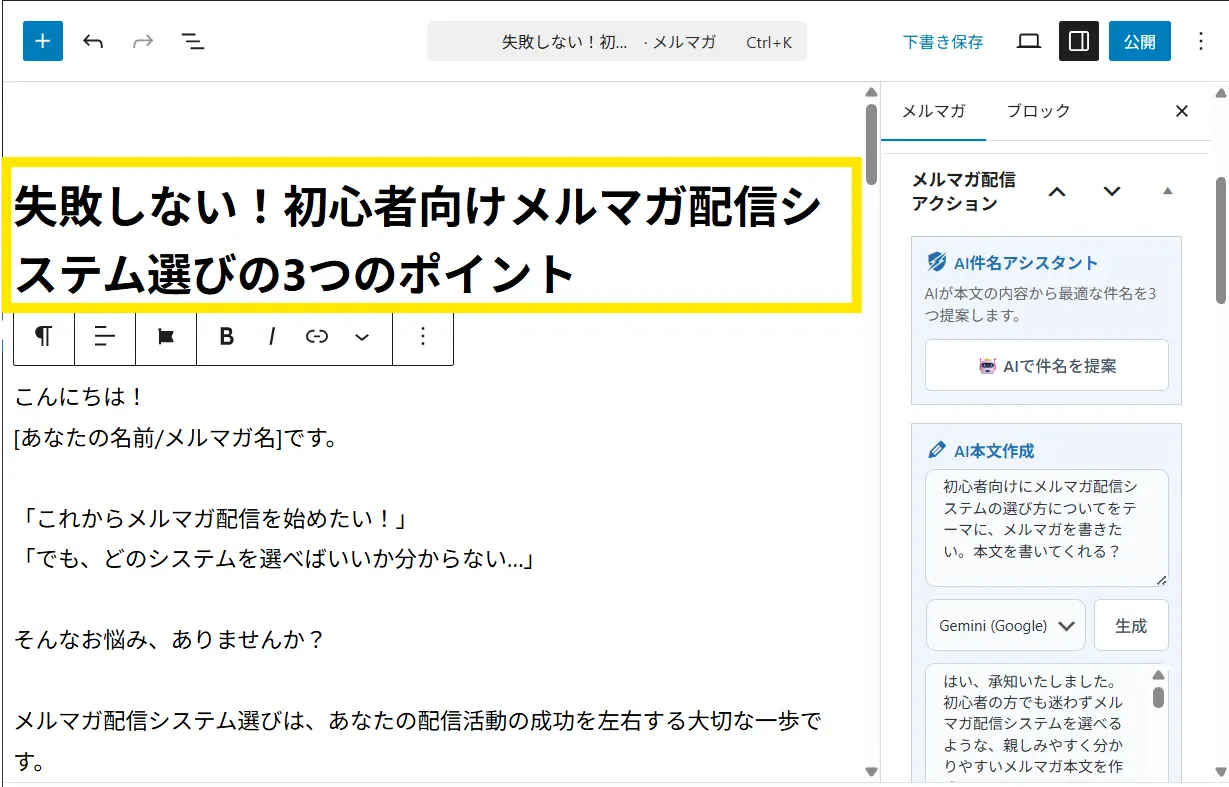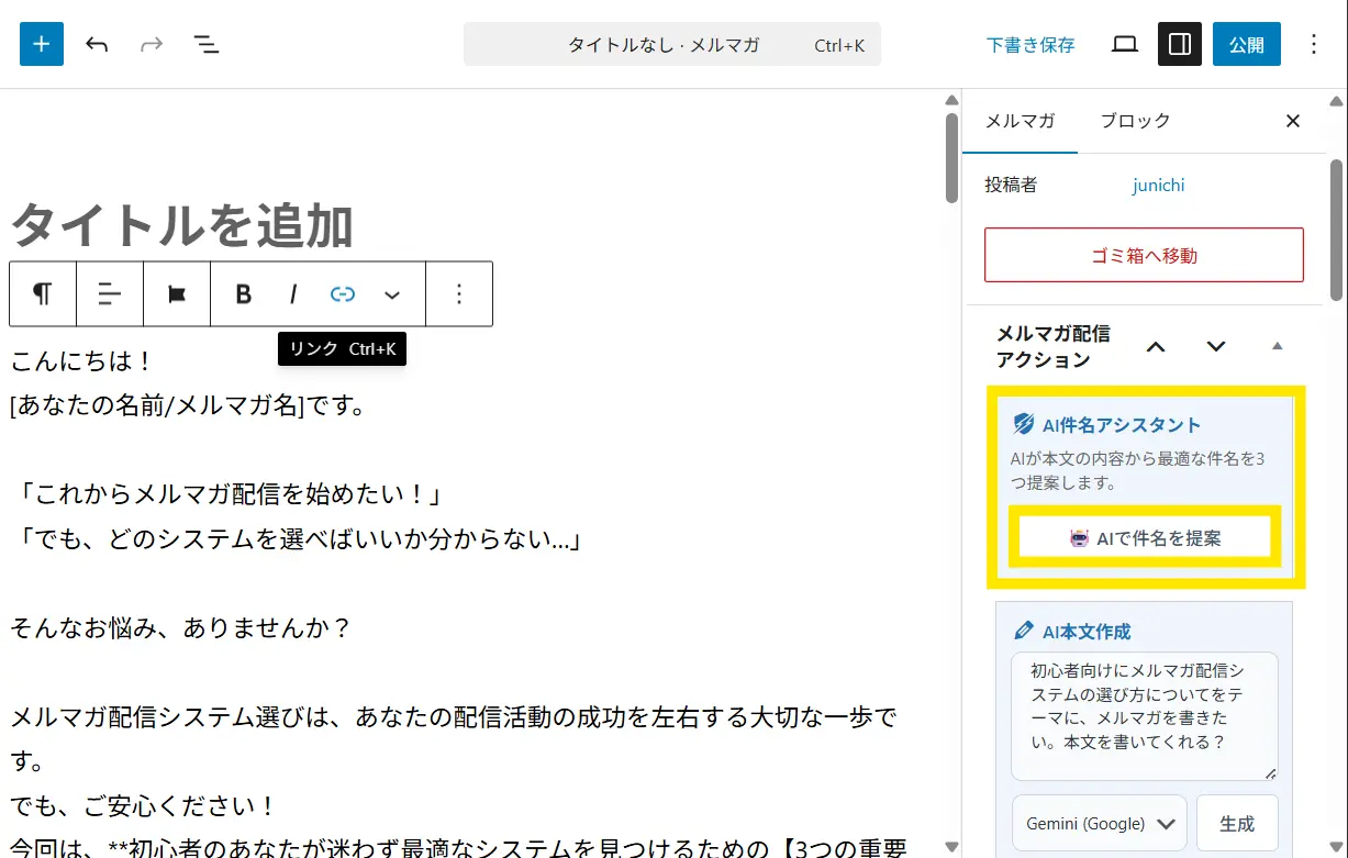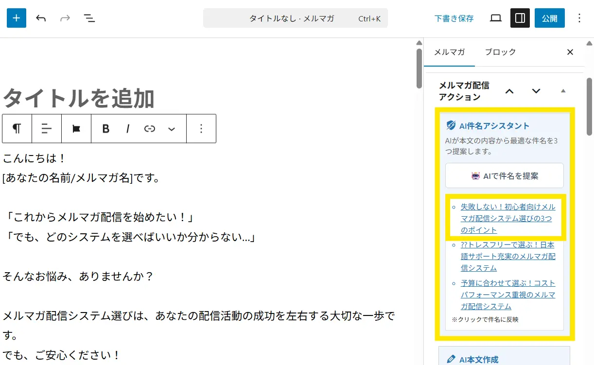 ↓左側のメルマガ本文が入っている状態で、「AIで件名を提案」をクリックします。
