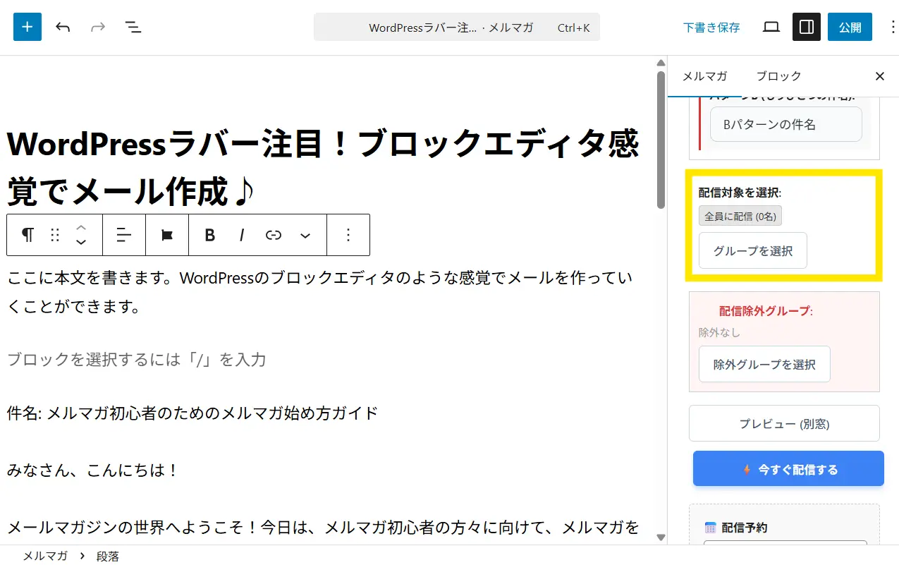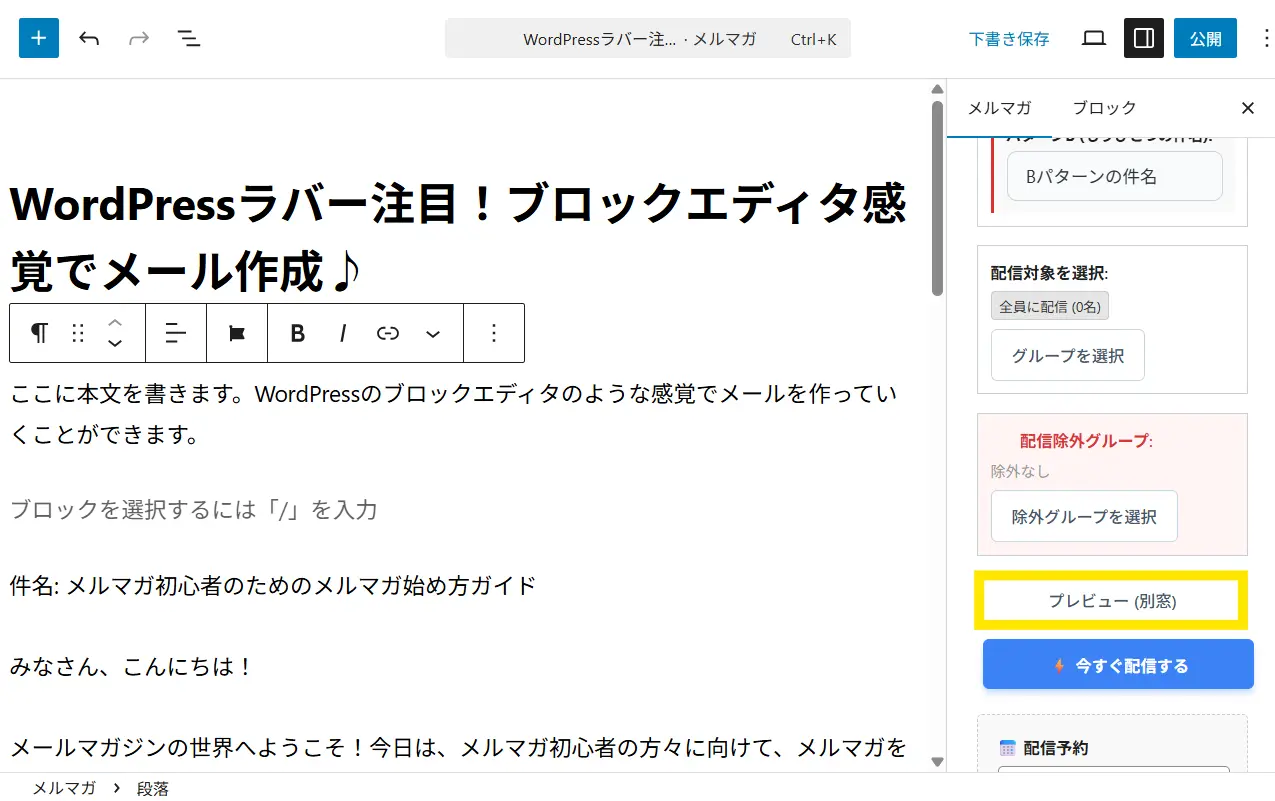 一部のWordPress専用ブロックはメルマガ作成画面では使えないように消してあります。 理由は、実際に配信された受信メールにそのブロックが反映されない場合が多いからです。