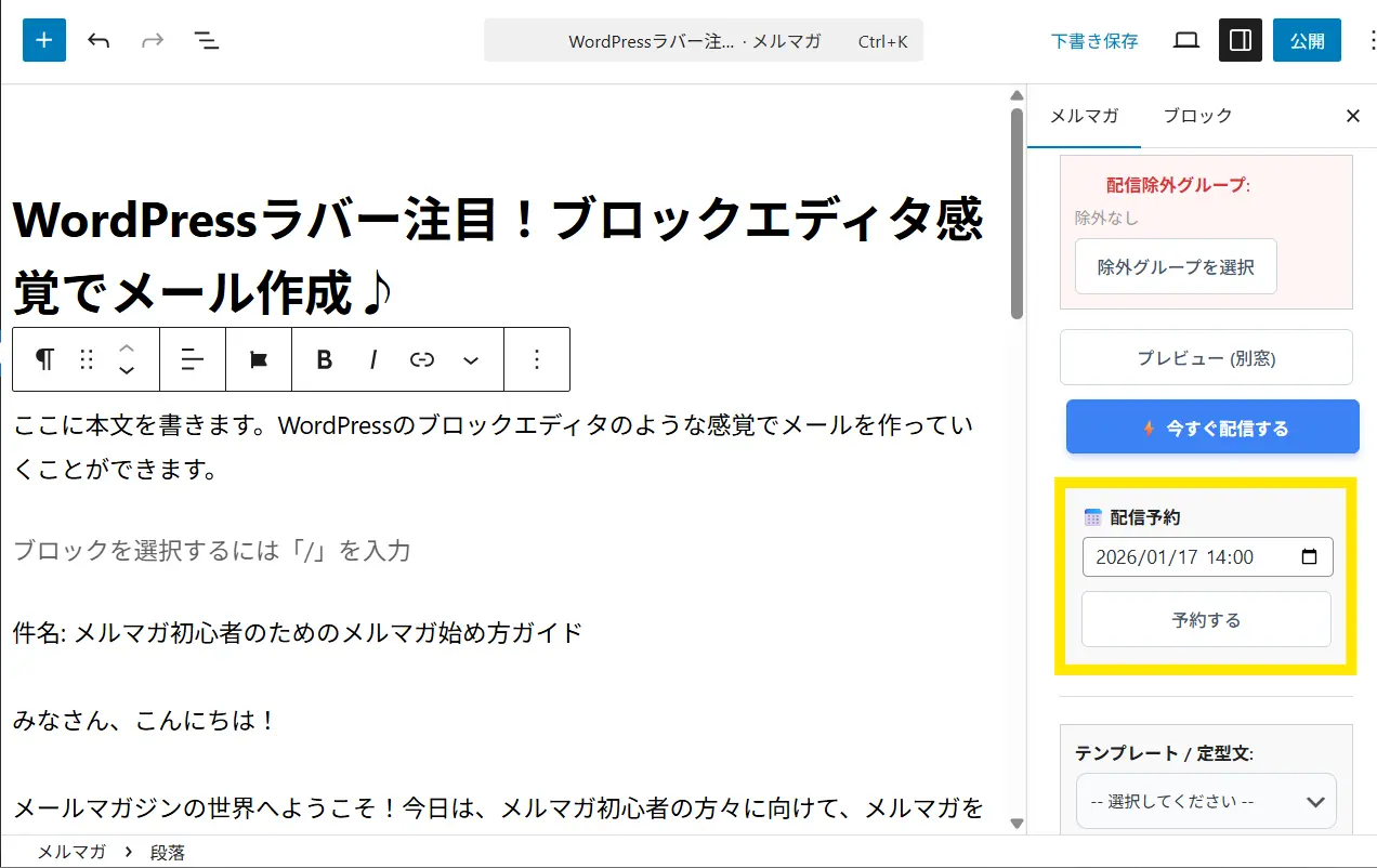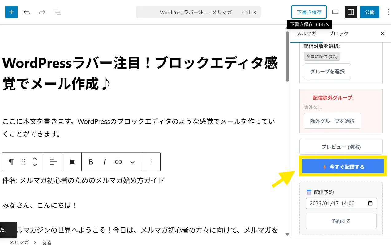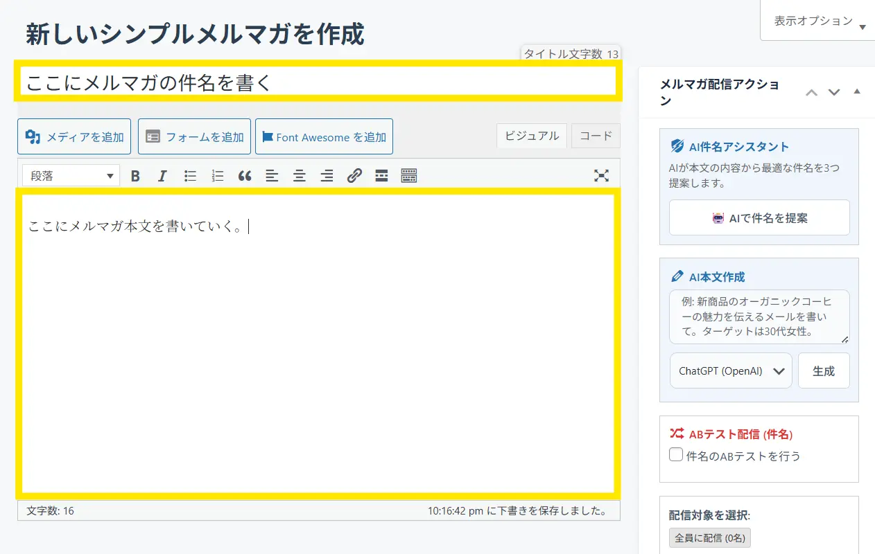 ↓そうすると、昔ながらのクラシックエディタでメルマガを書くことができます。タイトルに件名を、本文にはメルマガ本文を入力して下さい。