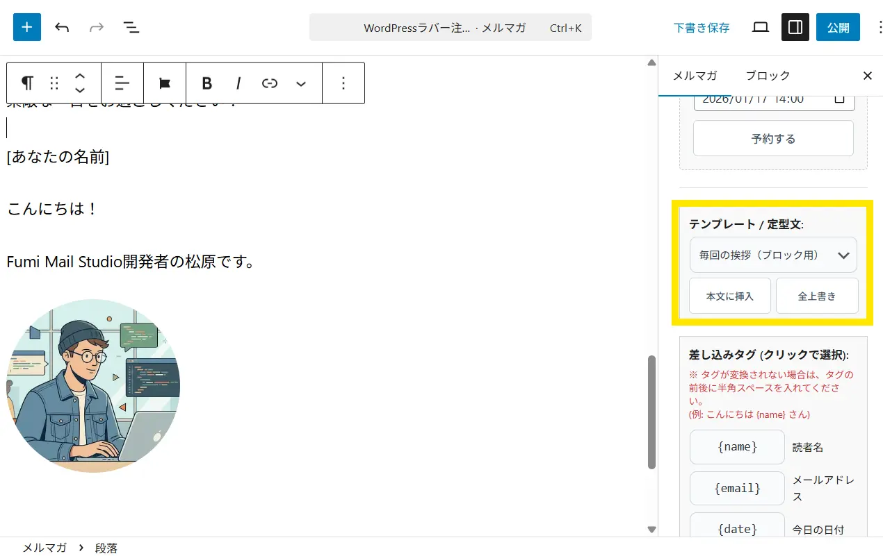 ↓あらかじめ登録したテンプレートを本文に挿入することができる機能です。