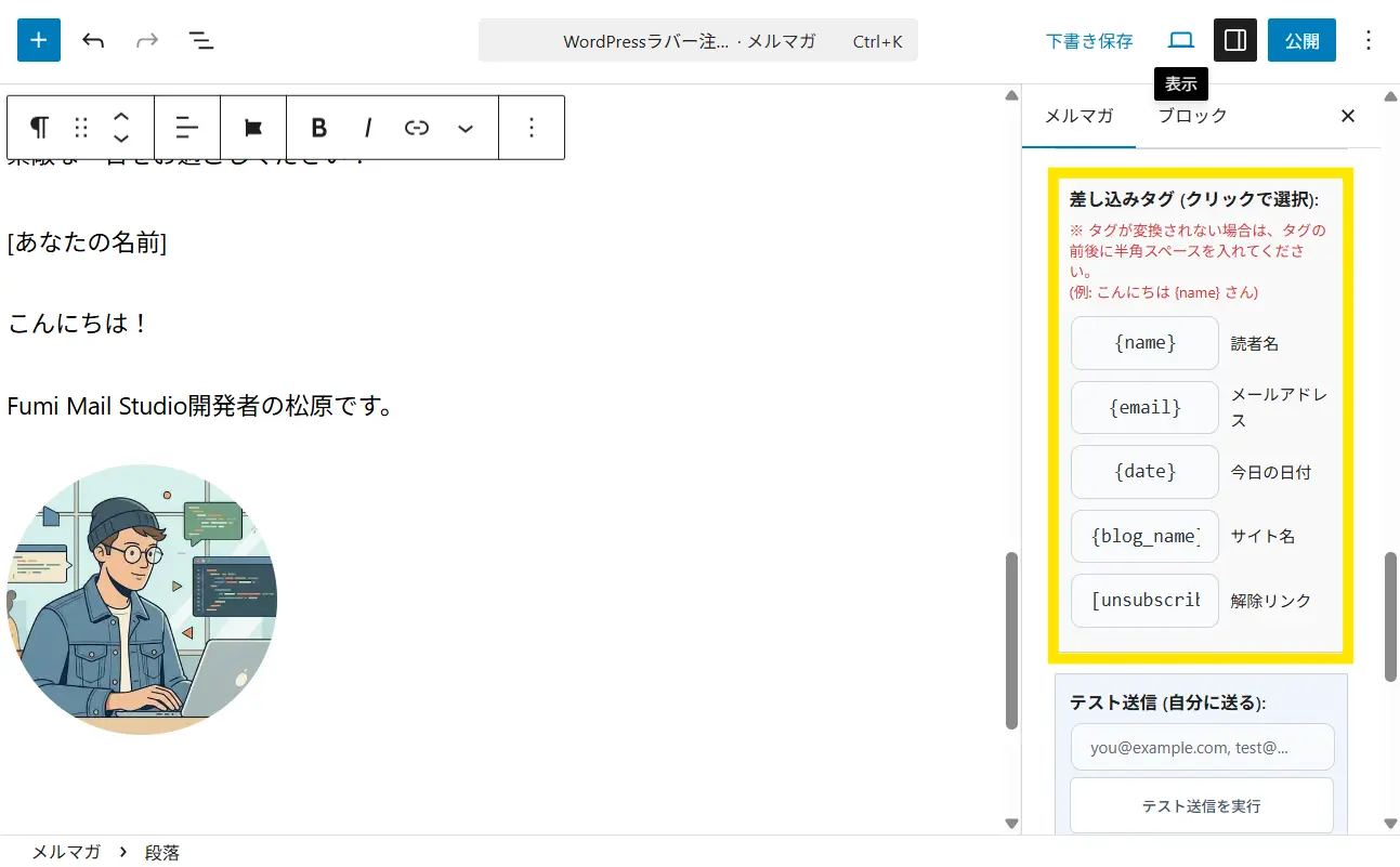 ↓本文に対象のタグを入れることで、そのタグが読者の名前に変わったりする機能です。