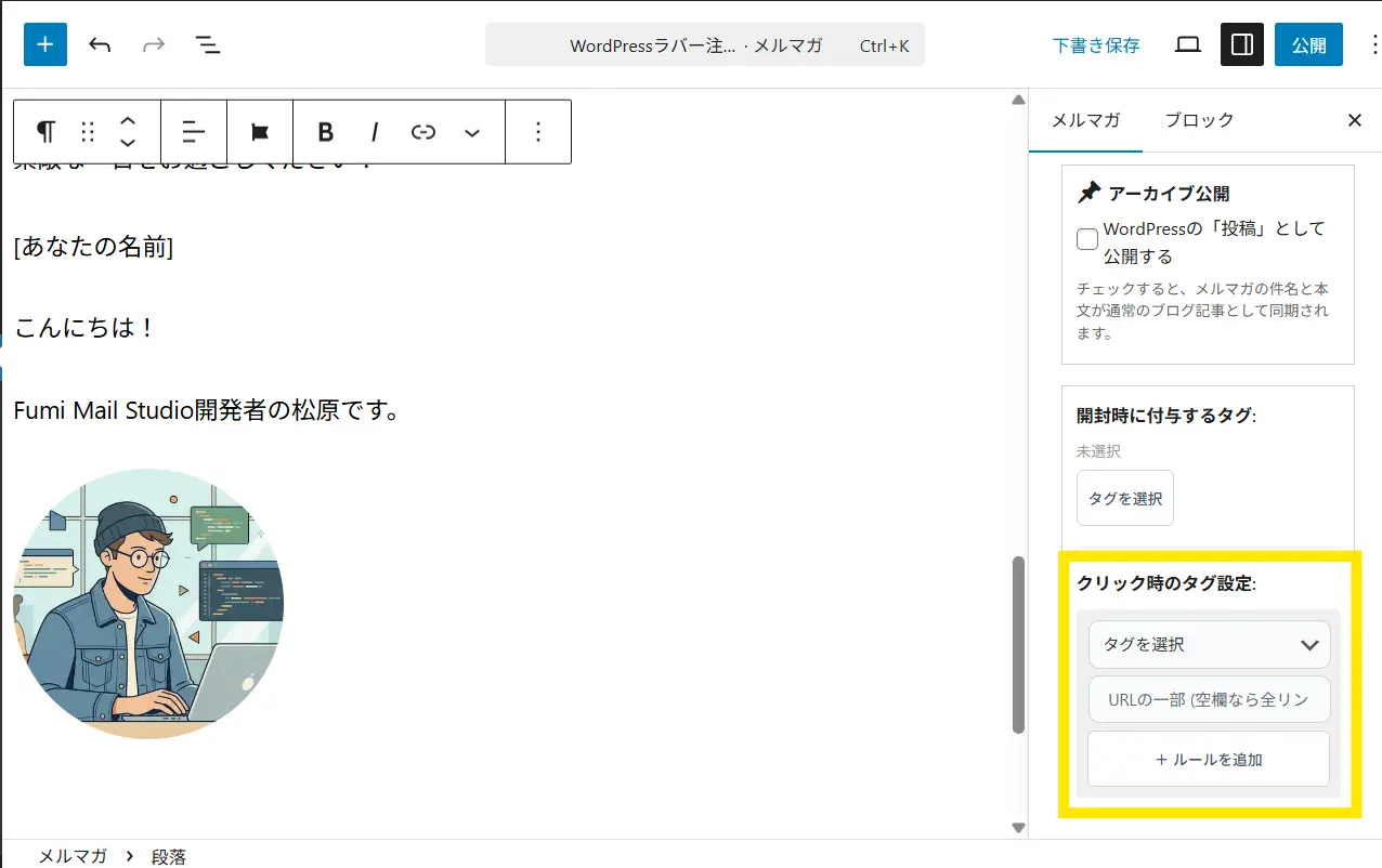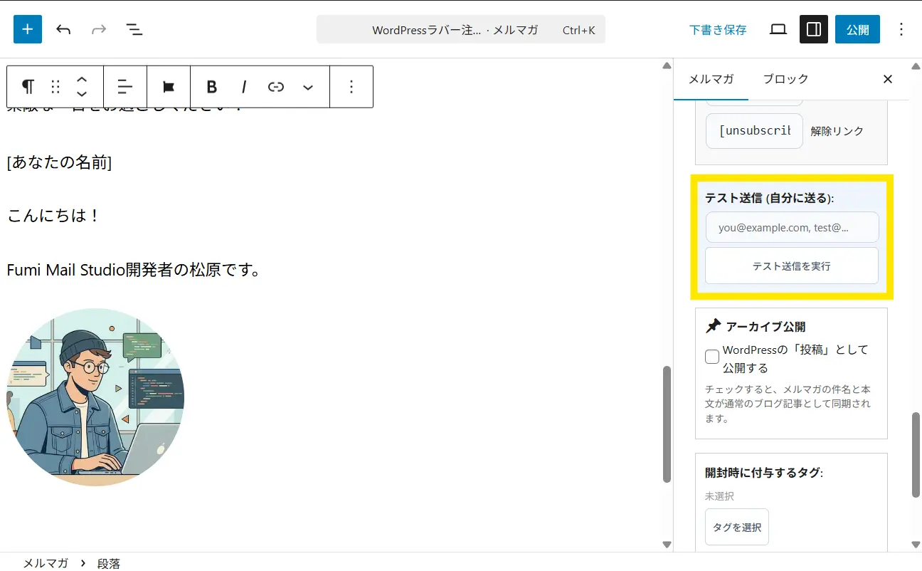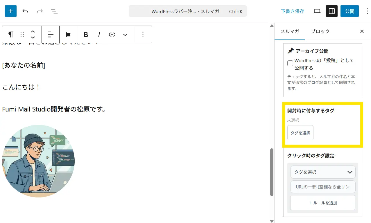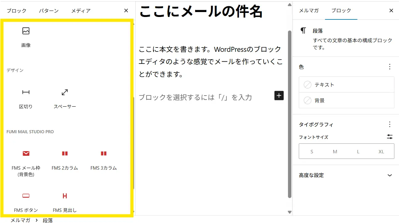 Fumi Mail Studio Proでは、ブロックエディタで執筆する方法・クラシックエディタで執筆する方法のいずれかを選んでメルマガを書くことができます。