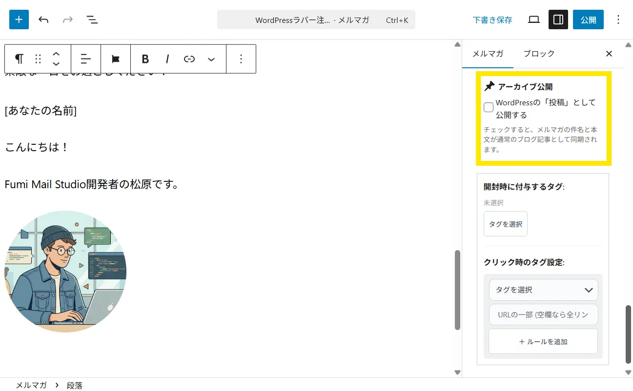 ↓ここにチェックを入れて「公開」をすることで、WordPressの「投稿」として同時に公開される機能です。メルマガも配信できるし、ブログ記事も同時に増やせる一石二鳥の機能です。