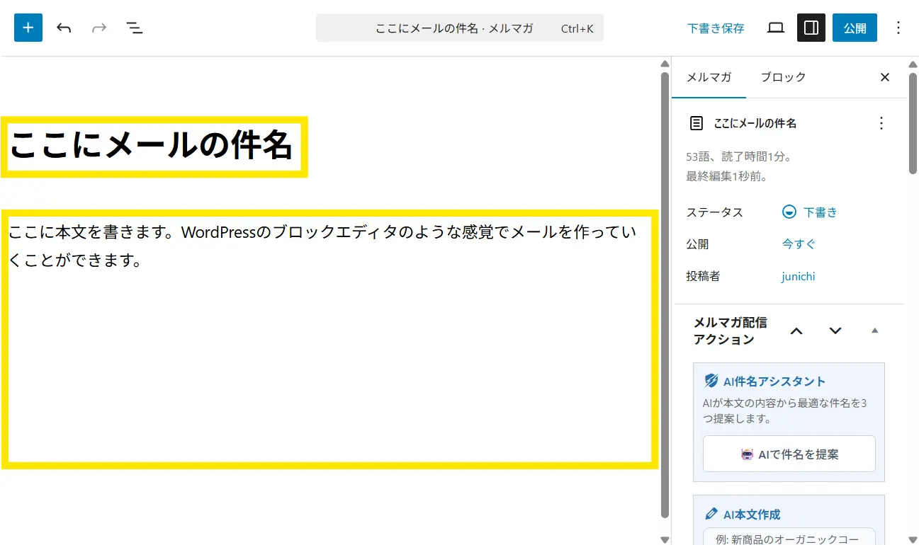 ↓タイトル部分にメルマガの「件名」を。本文のところにメルマガの本文を書いていきます。