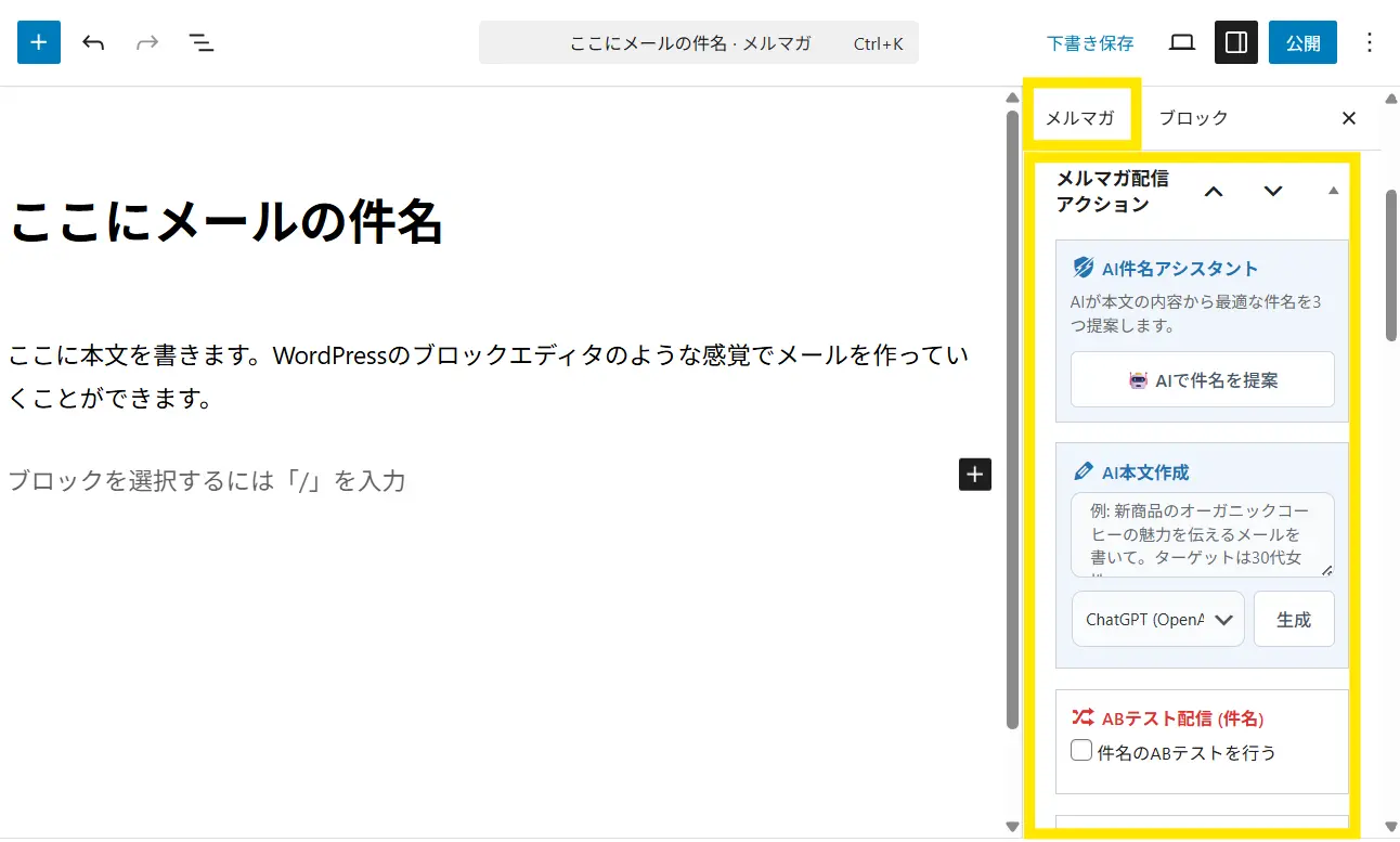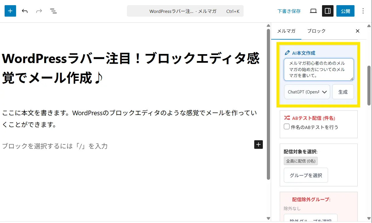 ↓【AI本文作成機能を使うには、ChatGPTかGeminiのAPIキーが必要です。】 この機能を使うと、メルマガ本文をAIに作ってもらうことができます。作成してもらった文章をワンボタンで、本文に反映することができます。