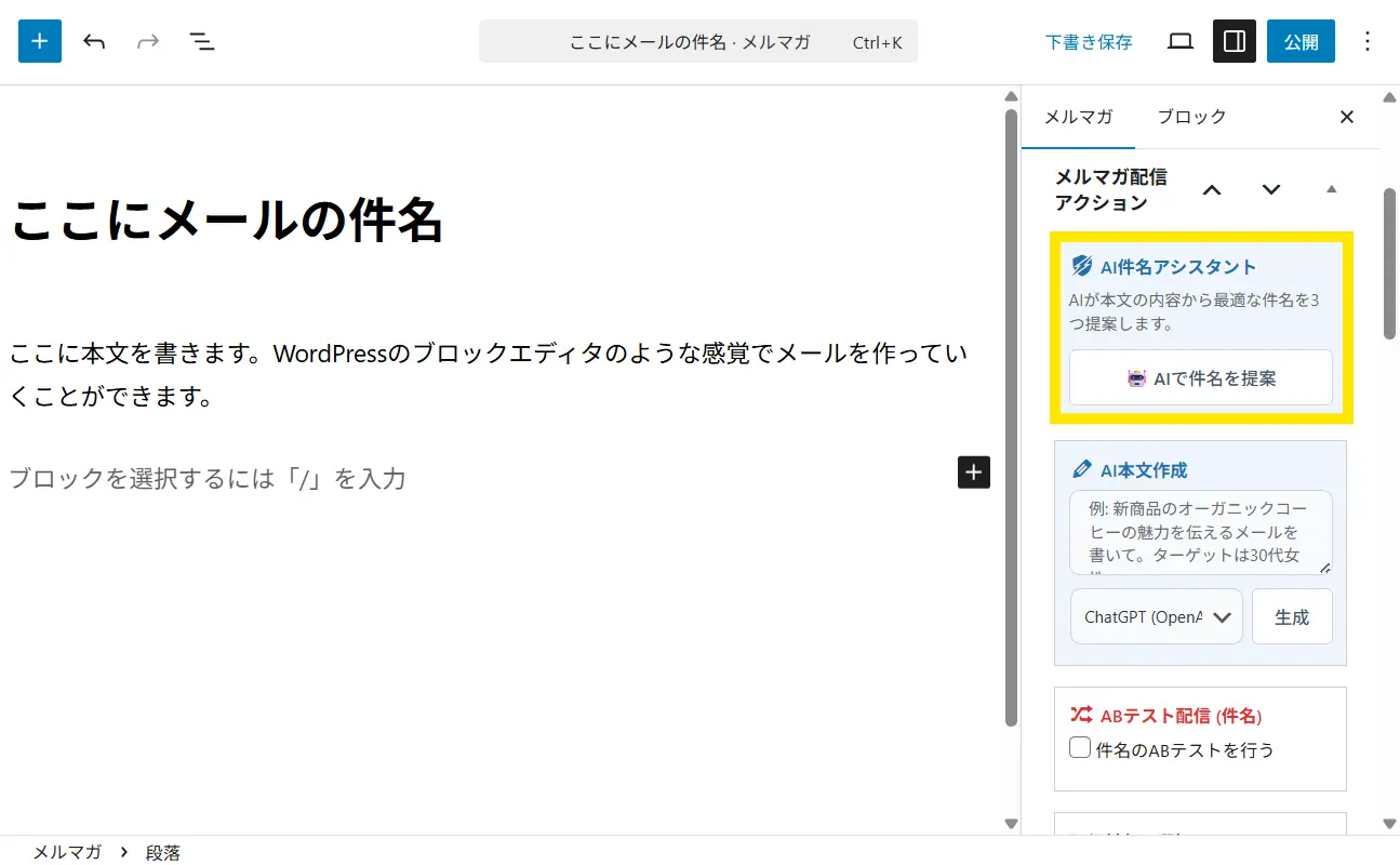 ↓【AI件名アシスタント機能を使うには、ChatGPTかGeminiのAPIキーが必要です。】 この機能を使うと、メルマガ本文の内容を読み取って件名の案を3案出してくれます。