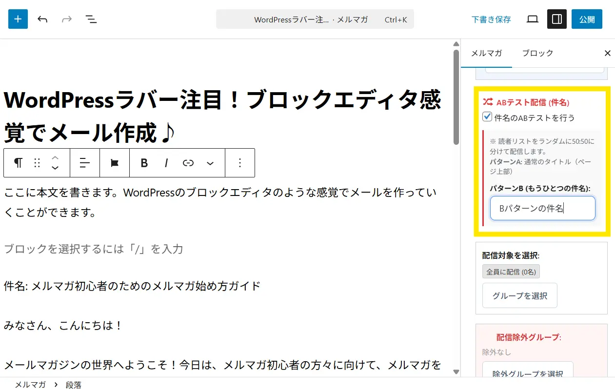 ↓件名のA/Bテストを実行できる機能。どちらのパターンが開封率が高いか?をテストできます。※結果は「配信レポート」で確認ができます。