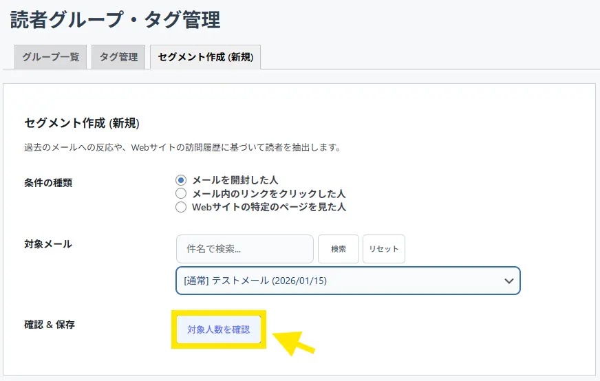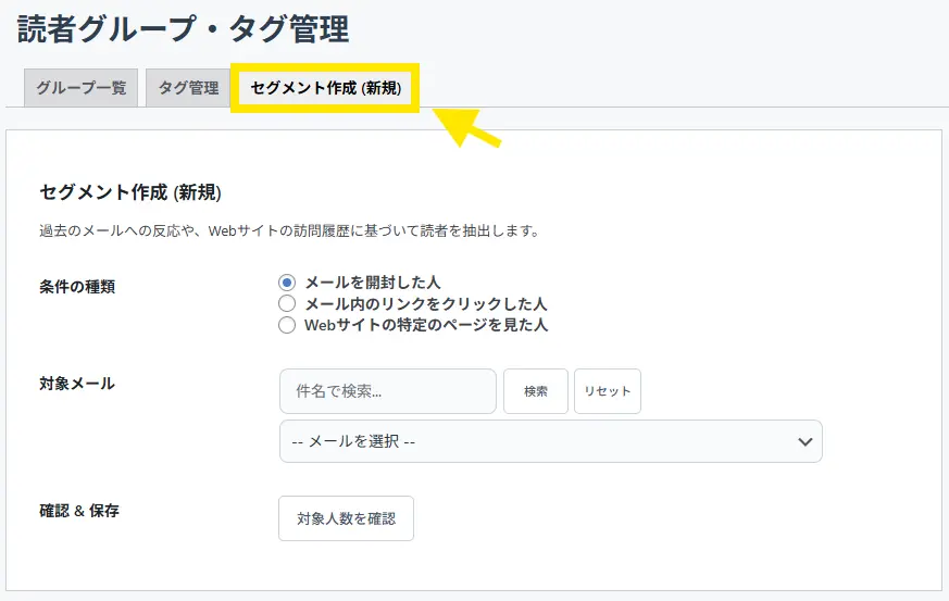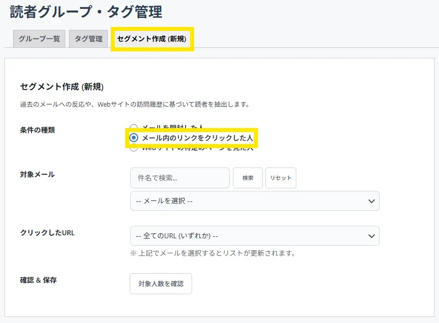 「セグメント」というのは、特定のメールを開封してくれた人、リンクをクリックしてくれた人などをグループ化して、より濃い見込み度の高いユーザーにメルマガを届けるための読者区分を作る機能です。