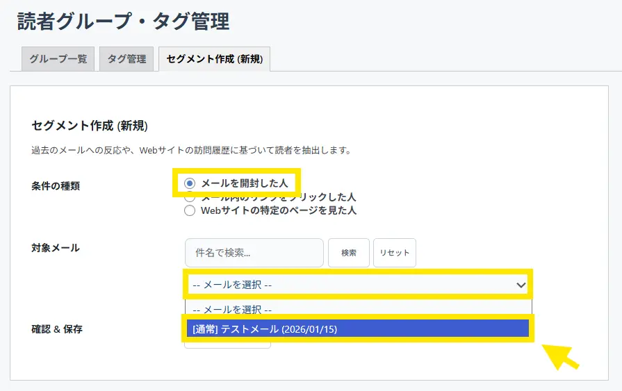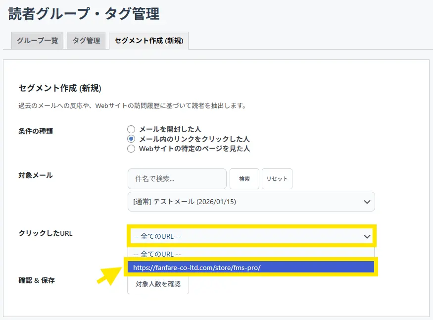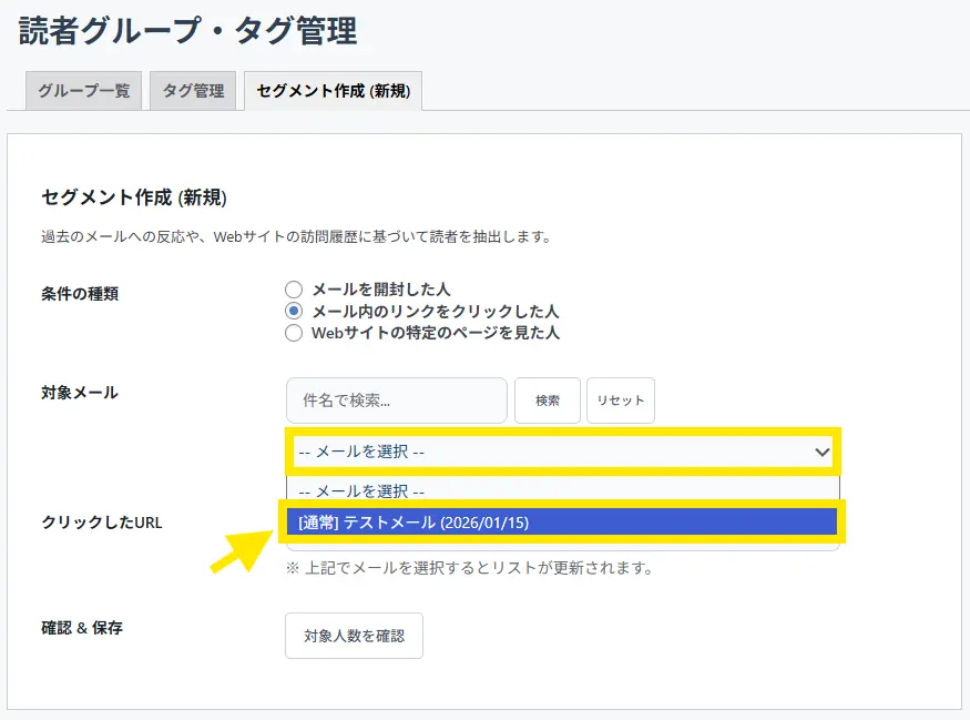 ↓対象メールの「メールを選択」からセグメントを作りたいURLが記載されているメールを探して選択します。