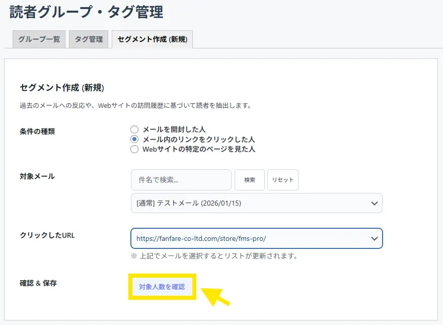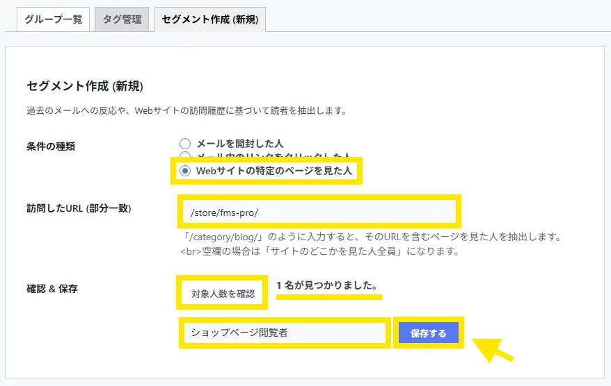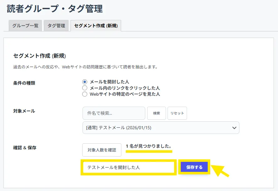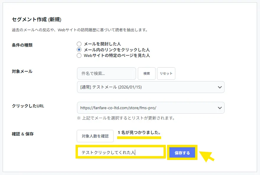 ↓クリックした読者さんがいれば「●名が見つかりました。」と出ます。そのままセグメント名を入力し、「保存する」ボタンをクリックしましょう。