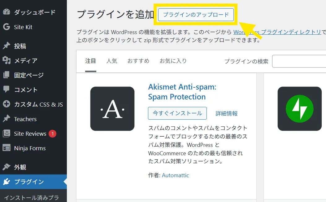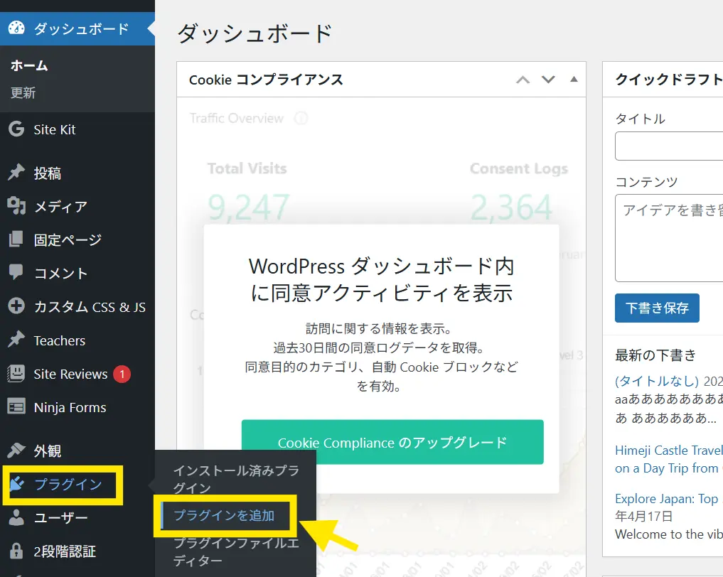 ↓まずはWordPressのダッシュボードの「プラグイン」>「プラグインを追加」へいきます。