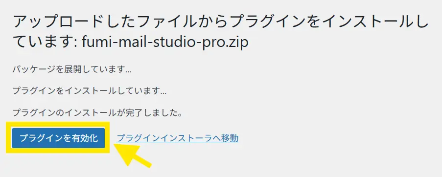 ↓しばらくするとインストールが完了します。「プラグインを有効化」ボタンを押しましょう。