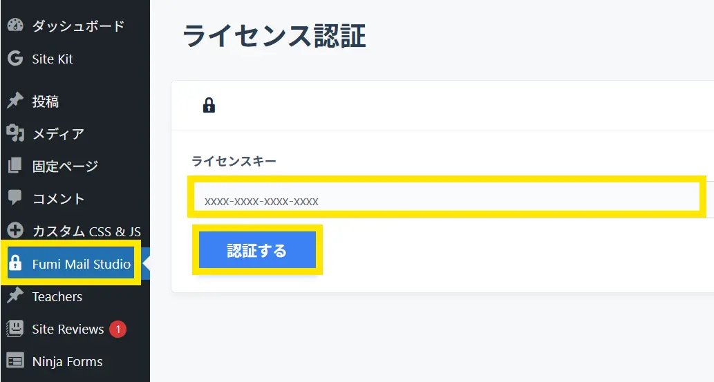 ↓左のメニューの「Fumi Mail Studio」をクリックすると、ライセンス認証の画面になります。ご購入時に届いたメールにライセンスコードが記載されています。そのコードを貼って「認証する」ボタンを押しましょう。