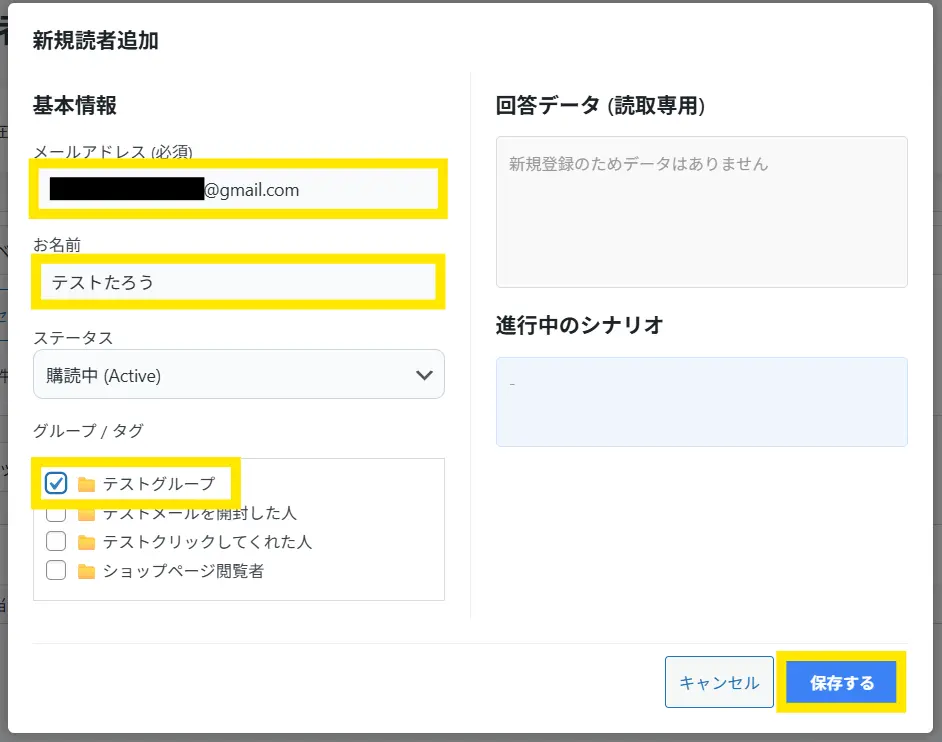 ↓登録画面が出ます。「メールアドレス」「お名前(任意)」「グループ/タグ」を入力し、「保存する」ボタンを押します。