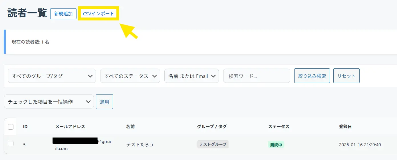 ↓上部の「CSVインポート」を選びます。