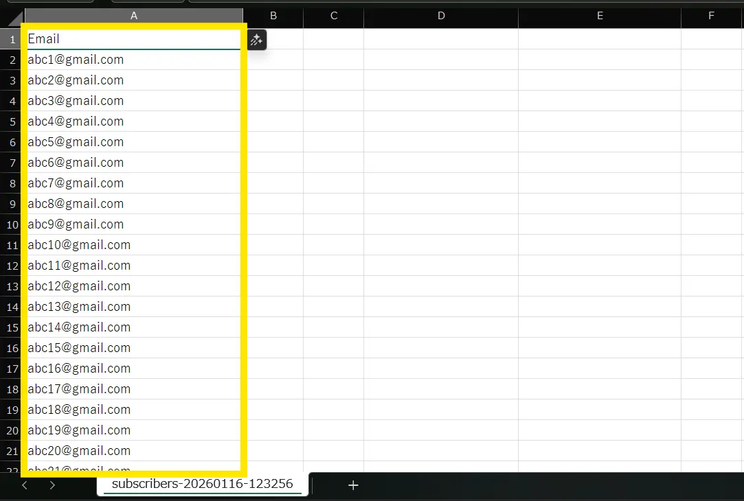 ↓インポートするCSVファイルは、1列に登録したいメールアドレスを並べておいて下さい。