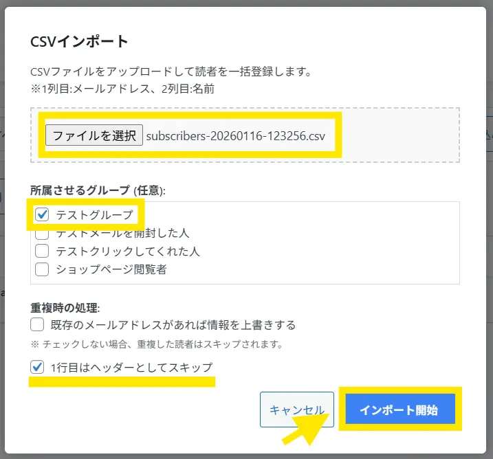 ↓CSVインポートの設定画面では、「ファイルを選択」でCSVファイルを選び、所属させるグループを選び「インポート開始」を押します。
