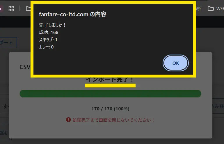 ↓このように「成功」に数字が入っていればインポートは完了です。「OK」ボタンを押しましょう。
