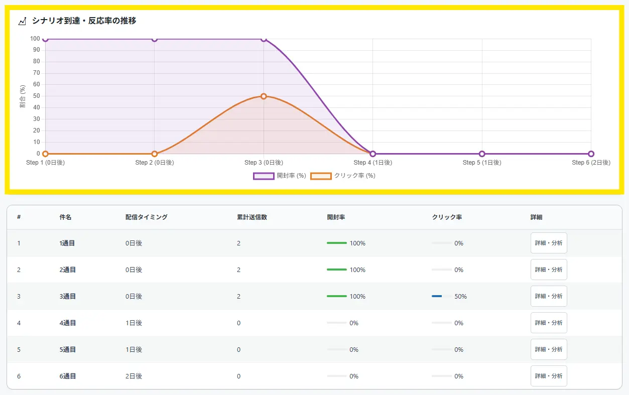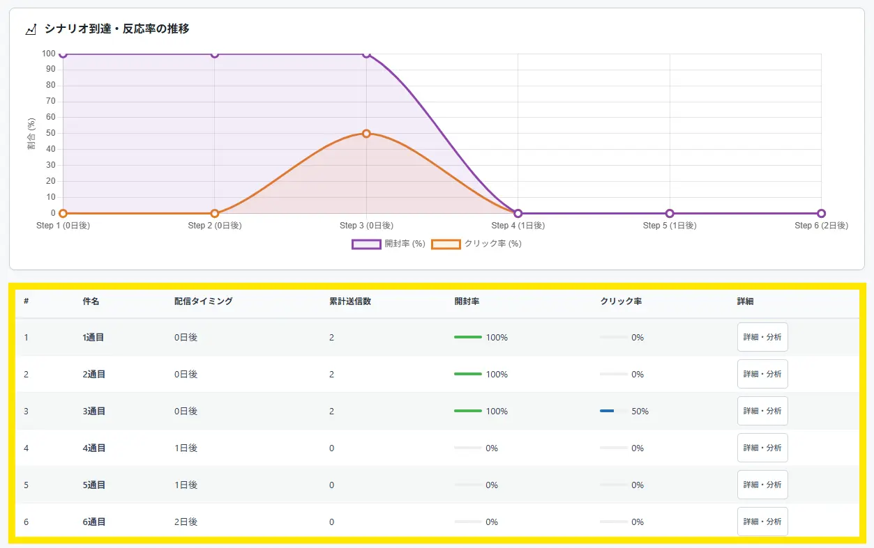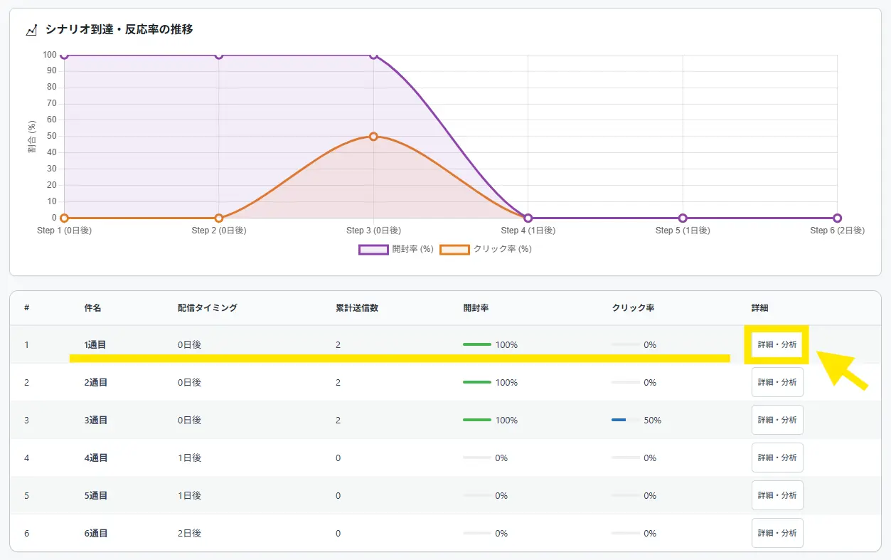 ↓さらに下部にはそれぞれのステップメール1通1通のデータ(開封率やクリック率)を確認できます。