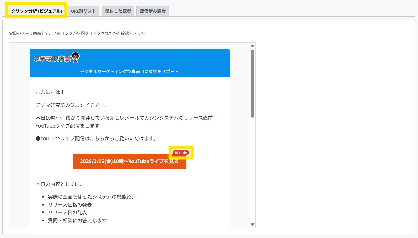 ↓そうすると、配信したメールのどのURLがクリックされたか?が見た目でも確認ができます。