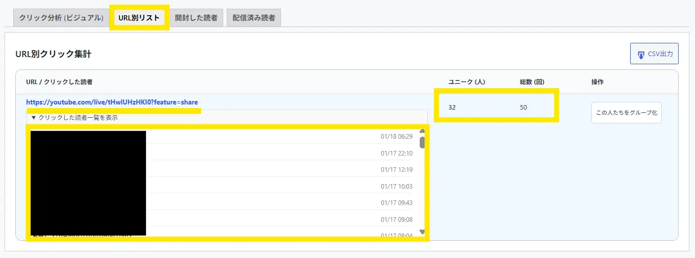 ↓「URL別リスト」のタブに切り替えると、クリックされたURLとクリックした読者一覧、クリックした人数(ユニーク)、総数(回)が確認できます。