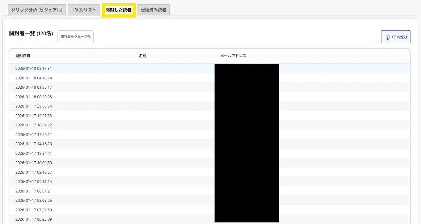 ↓「開封した読者」タブに切り替えると、メールを開封してくれた読者一覧が出てきます。